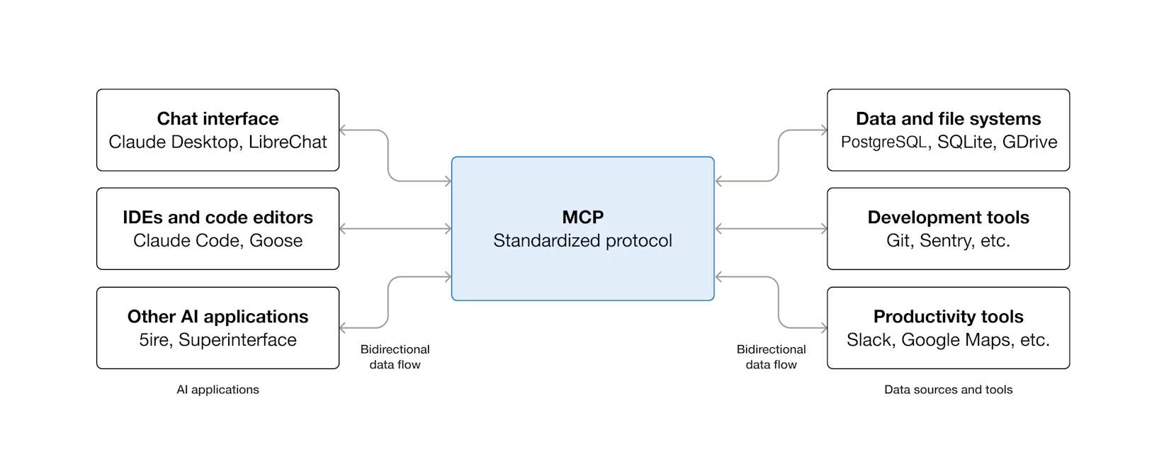 可以将 MCP 视为人工智能应用的 USB-C 接口。正如 USB-C 提供了一种连接电子设备的标准化方式一样,MCP 也提供了一种将人工智能应用连接到外部系统的标准化方式。