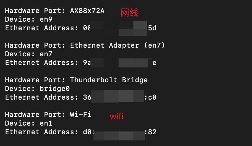 networksetup -listallhardwareports命令输出中可根据 Hardware Port 判断是 Wi-Fi 还是有线网卡,并记住对应的 Device 名称。例如,有线网卡为 en5,Wi-Fi 为 en0。