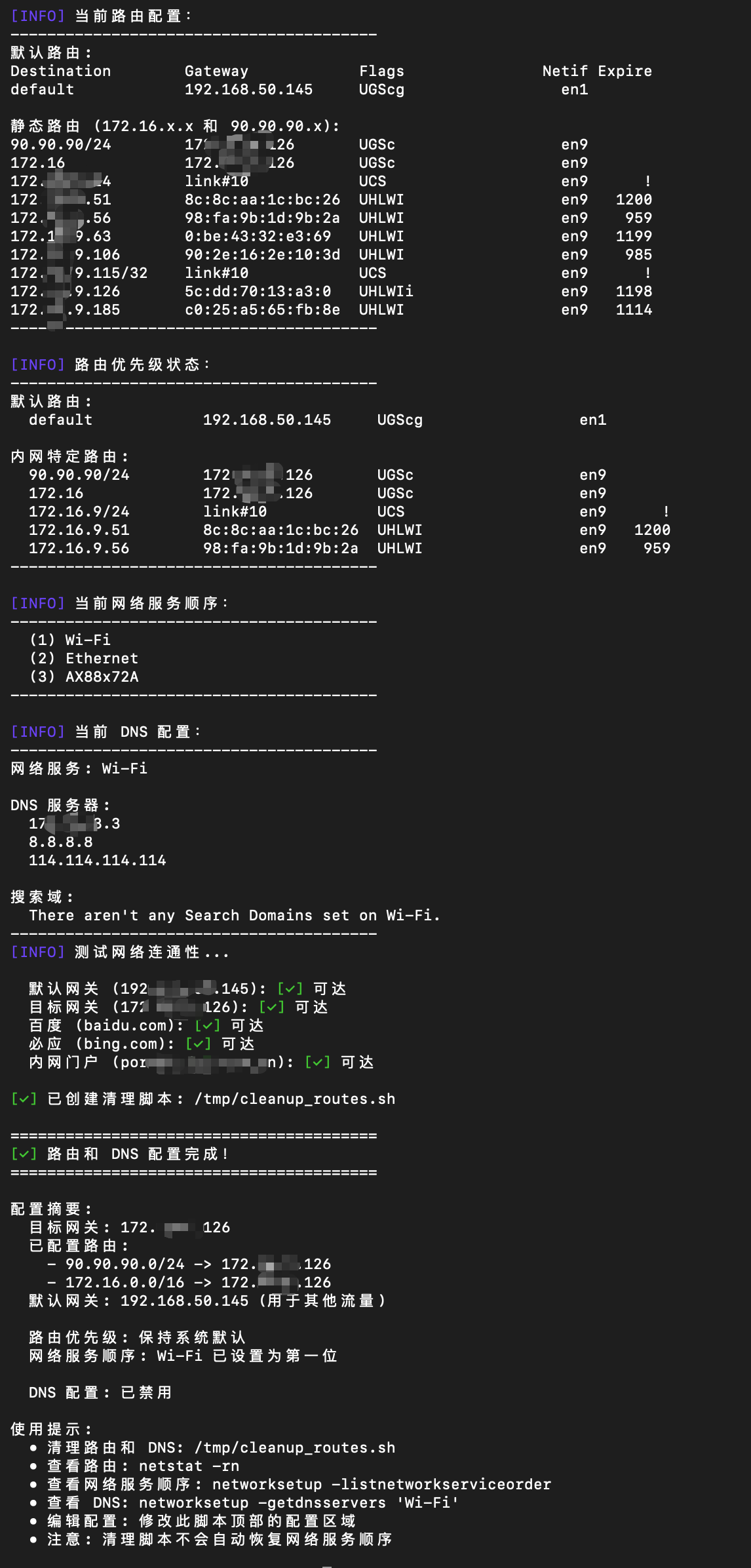 echo " 路由优先级: Wi-Fi 优先(已删除内网默认路由)"